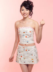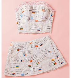 東日本大震災の「被災者の方々をはじめ、日本全体に少しでも勇気や元気を与えられれば」と、トリンプの世界36の国と地域のグループ会社から寄せられた54通の手書きのメッセージと国旗をコルセットと巻きスカート全体にプリントした。