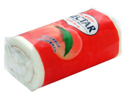 不二家の「ネクター」がロールケーキに。桃のクリームと果肉をロール生地でくるくるっと巻いている。