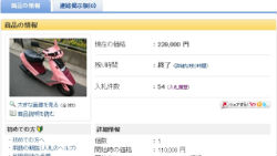 「シャア専用バイクV100S(シャアザクオッサンホイホイ歳ゆえの過ち」という商品名でYahoo!オークションに出品されたこのバイクは、シャア専用ザク風のデコレーションを施されたスズキのアドレスV100S。オッサンかどうかは分からないが多くのユーザーを「ホイホイ」し、アクセス総数は75万件を突破。入札開始額は11万円で、最終的に落札額は23万9000円となった。