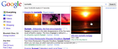 今回の刷新により、Web検索結果ページにも、画像検索結果ページと同様、画像がタイル状に並ぶようになった。サムネイルにマウスカーソルを合わせると、追加情報が表示される。