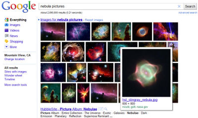 また検索キーワードに「photos」「pictures」「images」という単語が入っている場合、画像を探している可能性が高いと判断し、Web検索結果ページに画像を多く表示する。例えば「nebula pictures」(星雲 写真)と検索すると、Web検索結果の上部に画像が多く表示される。