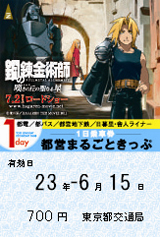 映画「鋼の錬金術師 嘆きの丘の聖なる星」の公開記念で、限定5万枚を発行。都営地下鉄の各駅と日暮里・舎人ライナー各駅の自動券売機で発売する(押上駅、目黒駅、白金台駅、白金高輪駅、新宿線新宿駅を除く)。価格は大人700円、小児350円。