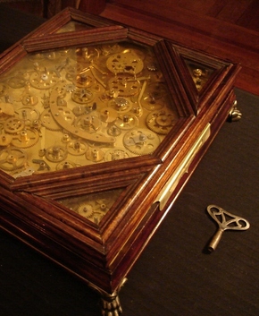 オルゴールのような木製のケースを開けると、そこには古ぼけたキーボードとタッチパッド。ヴィクトリア朝時代に使われていたノートPCだろうか――そんなはずはない。これはロサンゼルスのメカアーティストであるリチャード・ナジ氏の作品「Steampunk Laptop」だ。