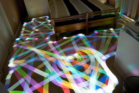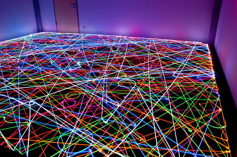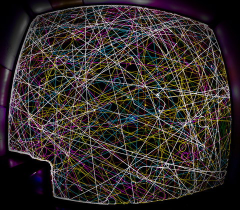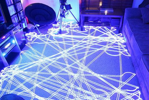 部屋を暗くして長時間露出して撮影された写真は、Flickrプールの「The Roomba Art」に並んでいます。こうした光の軌跡を切り取った写真はいろいろありますが、なるほどルンバの動きはアートになりえるんですね。しかも、しっかりその仕事ぶりも確認できます。