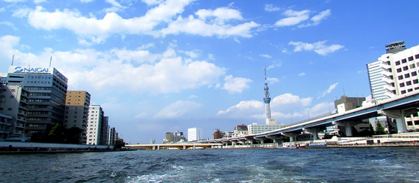 隅田川の川上りでは、近づいてくるスカイツリーを楽しむことができる