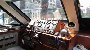 豊海橋から日本橋までは10分ほど。首都高の下を流れる日本橋川を上っていく。日本橋や茅場町はよく訪れるのだが、船から眺めると初めて来る場所のように感じられる。川に沿って建つ建物の壁面にレトロな感じを受けたりと、とても新鮮な体験ができた。途中、ボートの練習をしていた学生たちが見慣れない船に驚いていたようだった。