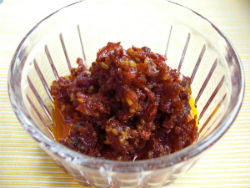 刻んだドライトマトを醤油、バジル、唐辛子で味付けした調味油につけ込んだ。料理に使うだけでなく、そのままご飯やパスタ、パンにかけたり、おつまみとして食べることもできる。1瓶にトマト4個分に相当するドライトマトが入っている。