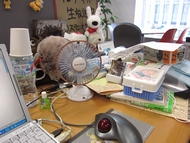 筆者の(散らかった)デスクで頑張っている扇風機くん