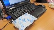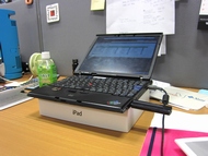 iPadの空箱も熱対策に活用。PCと机の間に空間を作り、熱がたまるのを防ぐ