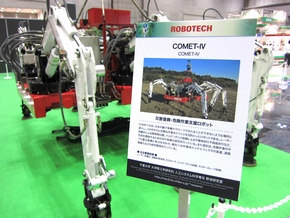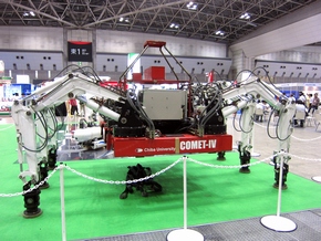 COMET-IVは、ガソリンエンジンを搭載した6脚ロボット。当初の研究では、目的に応じた作業用アームを取り付けた多用途ロボットになる予定だったが、東日本大震災を受けて、用途を災害復興に絞って開発を進めている。人や通常の重機が入れない場所でのがれき撤去を目指す。