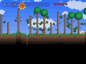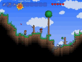 ゲーム内容はひと言で言えば「Minecraft」の2D版と言ったところ。広大なマップの中で、木を切り倒したり、地面を掘ったりしながら、自由に建物やオブジェを作って遊ぶことができる、いわゆる「サンドボックス型」と呼ばれるゲームです。