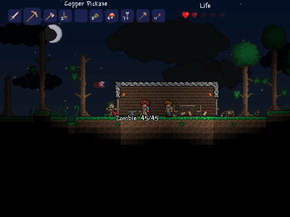 マップはランダム生成で、ゲーム開始時に「Small」、「Medium」、「Large」の3種類からサイズを選択する仕組み(「Small」でもむちゃくちゃ広いので、うっかり初プレイで「Large」を選んだりしないように!)。生成されたマップに降り立ったら、あとは基本的に何をしようがプレイヤーの自由です。斧でそこらへんの木を切って家を建てるもよし、手近な洞窟を見つけて探検してみるもよし。世界の果てにはまだ見ぬダンジョンや宝箱が存在し、地底深くにまで穴を掘り進めていけば、やがては溶岩が吹き出す地底の大空洞に行き着いたりもする。「家の地下を掘っていたら巨大な地底湖にブチ当たってしまった!」――なんてドラマチックな展開もあって、とてもランダム生成とは思えないような、驚きと変化に富んだマップも「Terraria」の大きな魅力のひとつとなっています。