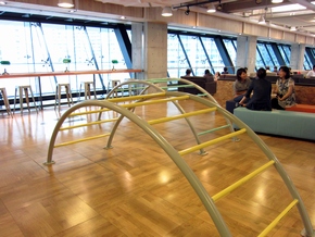 このフロアには授乳室も設けられている。NHNは女性の雇用サポートにも力を入れており、事実、社員の40%は女性社員だ。300人規模の託児施設から女性専用の休憩室まであり、仕事を早く終わらせて社内で子どもと一緒に遊ぶ日も定期的に設けられている。確かに4階のカフェスペースにはジャングルジムやうんていが置かれていた。