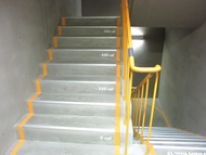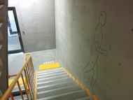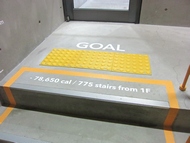 最後に、運動不足の社員のために用意された階段を紹介したい。入口にはトラックと書かれており、床に引かれたオレンジの線が陸上競技のトラックを連想させる。階段には消費カロリーが書かれており、1階から27階まで775段を上り切ると約80kcalの消費になるそうだ。