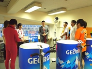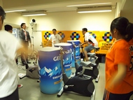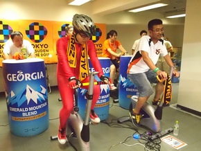 僕たちは攻守交代のタイミングで休憩を取る。スタッフのお姉さんたちが水やスポーツドリンクを持ってきてくれるのだが、あまりゆっくりしている時間はない。目標の300Whを発電する以前に、僕の足は9回までもつのだろうか。さっきから両足が“まじでつりそうな5秒前”だ。