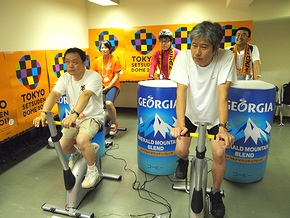 この日は巨人対横浜戦で、プレイボールは午後6時。その前に準備運動も兼ねて、ラジオ体操をすることになった。なんと、曲を流すために用意されたラジカセまで人力発電で動かす仕組みになっている。メンバーの1人が自転車をこぎ出すと、ちゃんとラジオ体操の音楽(なぜか英語バージョン)が流れてきた。