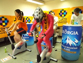 僕の今回のミッションを紹介しよう。読売巨人軍が節電への取り組みの1つとして実施している「東京ドーム発電所」プロジェクトだ。一般から募集した「発電MAN&WOMAN」に、巨人戦を見ながら自転車をこいで人力発電してもらい、その電気をヒーローカーの動力に使う。