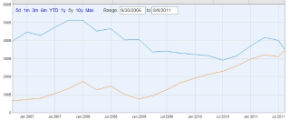 過去5年間のExxon(青)とApple(オレンジ)の時価総額推移(出典:YCHARTS)
