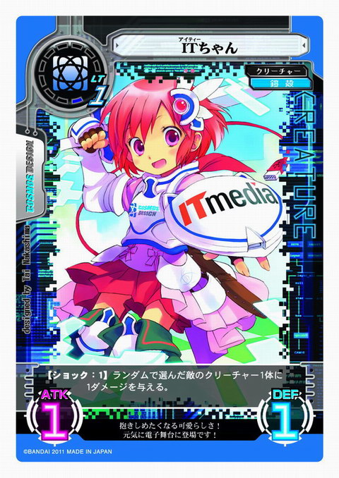 我々、ITmediaもちゃっかりコラボに参加。現在、ねとらぼのカバーガールも務める「ITちゃん」が参戦している。そのかわいらしいイメージどおり、ATK1、DEF1という期待(?)どおりの最弱ぶり。ただし、ランダムで選んだ敵のクリ―チャー1体に1ダメージ与える【ショック1】の効果が付属している。つまり実質ATK2。さらに注目してほしいのがLT1という手軽さ。つまり場に出てすぐに攻撃可能なのだ。