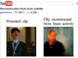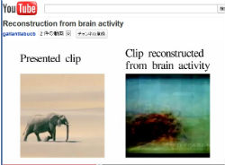 同氏の研究では、研究チームのメンバー3人が被験者となり、映像を見ながら視覚野の活動をfMRIで測定し、映像の形や動きと脳の活動パターンを関連づけるモデルを作成した。このモデルを使って、脳の活動から、被験者が実際に見た映像と似た映像を再現することができたという。不鮮明ではあるが、人の姿らしきものや、象が歩く場面に似た黒い影が動く映像が再現され、YouTubeで公開されている。
