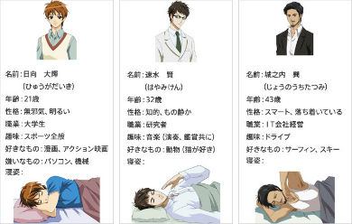 登場するイケメンはさわやかな大学生の日向大輝(21)、知的なメガネ男子の速水賢(32)、ダンディなおじさま城之内巽(43)の3人。イケメンたちとバーチャルコミュニケーションができ、画面をつついたりなでたりすると、イケメンが反応して「おつかれさま」などのセリフをささやいてくれる。甘い声で起こしてもらえるアラーム機能も装備。