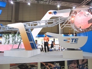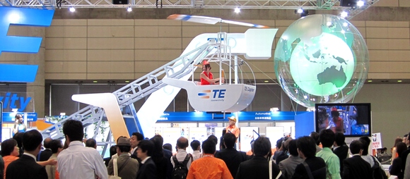10月4日に開幕した「CEATEC JAPAN 2011」のタイコエレクトロニクスジャパンブースで、人力で飛ぶヘリコプター「TE Copter」が展示されていた。実際に乗ることもできる。