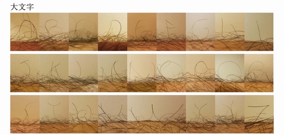 同大造形表現学部デザイン学科3年の金澤繭子さん(@knzw_myk)が「画材・PCを使わずに実用的書体制作をし使用例も提示せよ」という課題で制作した。「ふと彼のすね毛を見たら凄くボーボーで気持ち悪いって思った」ことが発想のきっかけ。毛を剃って文字の形にするのは見たことがあるが、「(生えたままの)毛自体がフォントになっているのは見たことないなと思った」という。