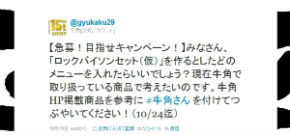 牛角は公式Twitterで10月19日、「みなさん、『ロックバイソンセット(仮)』を作るとしたどのメニューを入れたらいいでしょう? 現在牛角で取り扱っている商品で考えたいのです」と呼びかけた。この投稿は100人以上にリツイートされ、既に多くのアイデアが集まっているようで、Togetterにまとめられている。応募は10月24日までで、「#牛角さん」のハッシュタグをつけてつぶやくことが条件。