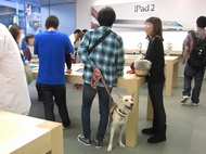 先週、iPhone 4S発売前日の銀座アップルストアで犬が散歩しているのを見ました。店頭ではなく店内の話です。海外ではアップルストア店内にピザを宅配してもらってその場で食べたり、ヤギを散歩させたりする動画が公開されていますが、日本ではあまり聞いたことがありません。どうなるんだろうとハラハラしながら見ていましたが、スタッフは驚きつつも、珍しいお客さんとして迎えていました。そのわんこはというと、iPad 2が気になったようで、テーブルに足を掛けて興味津々といった具合。まわりのお客さんも特に気にしていない様子でした。きっとスティーブ・ジョブズ氏も天国でほっこりしながら眺めていたことだと思います。