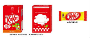 おとし玉キットカット2009年から販売しており、今年は2012年の干支である辰に合わせた新バージョンを販売。販売局を全郵便局(一部簡易郵便局を含む)に拡大するほか、一部の商品に、金色の特別なパッケージの個包装を1つ入れているという。