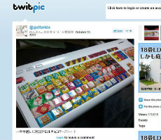 作ったのはTwitterユーザーの@guttaridaさん。チロルチョコを埋め込んだわけではなく、パッケージをキーに貼り付けて製作したものです。1年半かかったのはパッケージの種類を集めるため。甘いにおいがしそうですが、においは一切しないそうです。