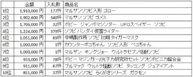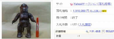 2009年11月〜2011年10月までの2年間を調べたところ、最も高額だったのはマルサン商店の「ゴロー」で191万円だった。2位はマルサン商店の「ゴメス」で190万2600円、3位はポピーの「ジャンボマシンダー UFOスペイザー」で170万6000円だった。