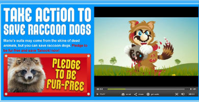 特設サイトでは「Super Tanooki Skin 2D」というスーパーマリオ風ゲームも提供。皮をはがれたタヌキらしき生き物が、血の滴るタヌキの毛皮を着たマリオを追いかける内容となっている。またタヌキの毛皮をはぐ様子を映した動画で、毛皮反対運動への支持を呼びかけている。