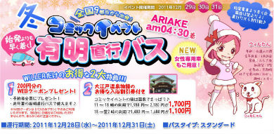 運行期間は12月28〜31日。冬コミ会場の東京ビッグサイト(東京都江東区)に近いゆりかもめ有明駅北側に午前4時30分に着く(4時30分より前の来場はコミックマーケット準備会により禁止されている)。料金は出発地によって異なり、片道3500〜6600円。宿泊付きのプランもある。特典として2012年夏の有明直行バスで使えるWebクーポン200円分もついてくる。