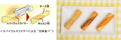 さらにうまい棒をらせん状に2等分できる「スパイラルスライサー」が3種の製品すべてに付いてくる。2等分した異なる味のうまい棒を組み合わせて、オリジナルの味のうまい棒を作れる。例えばチーズ味とめんたい味を合体させて、チーズめんたい味を作るといったことができる。