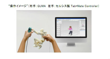 QUMAはセンサー内蔵の人型の入力装置を動かして、画面上の3Dモデルに同じポーズを取らせることができる技術。これにより、マウスやキーボードを使わずに、直観的に3Dモデルの操作できるようになる。ソフトイーサと電気通信大学発のベンチャー、ビビアンが中心となって開発してきた技術で、セルシスも協力している。