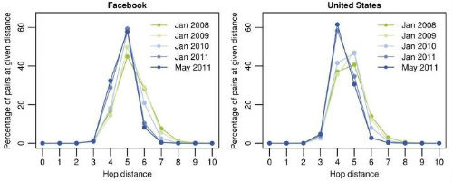 Facebookが伊ミラノ大学と7億2100万人のFacebookユーザーを調査したところによると、「Facebook上の2人のユーザーが何人の友達を介してつながっているか」は99.6%のユーザーが5人(6つのつながり)、99.2%が4人(5つのつながり)という結果だった。平均では4.74人だ。2008年には5.28人だったが、Facebookの拡大とともにユーザー同士の結びつきも進んだという。米国に限ると、この数字は3人になる。