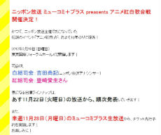 ニッポン放送主催のアニメソングイベント「アニメ紅白歌合戦」が2012年2月19日に開催される。およそ10年ぶりの復活となる。