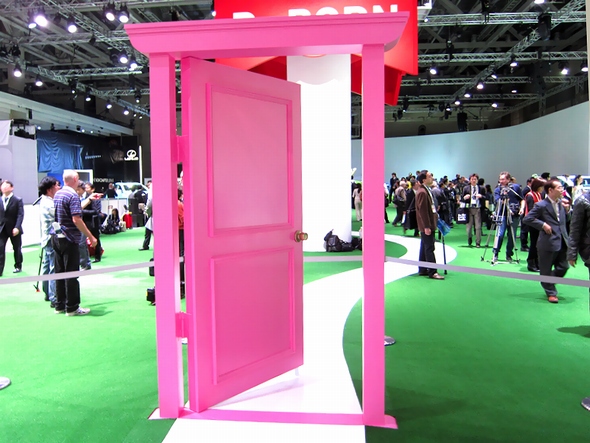 12月3日から一般公開が始まる東京モーターショー(東京ビッグサイト)で、「どこでもドア」を見つけました。扉の向こうではドラえもんやのび太くんが待っています。