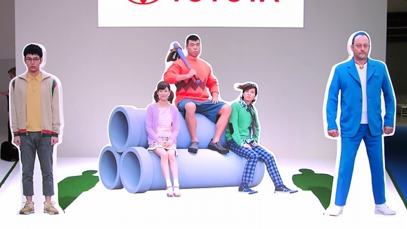 どこでもドアは「TOYOTA COLLECTION」と名付けられたトヨタブースに置かれています。ブースの入り口で出迎えてくれるのは、なんとトヨタのCMに登場する実写版のドラえもんたち――のパネル。ドラえもんに扮(ふん)したジャン・レノさんやのび太君に扮した妻夫木聡さんと一緒に記念撮影をすることができます。何度見ても、ドラえもんがドラえもんに見えない……。