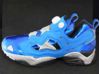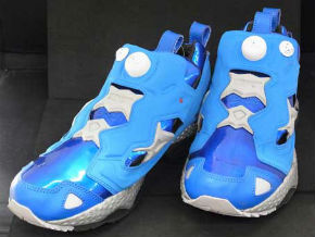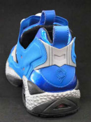 タチコマシューズは、リーボックのハイテクスニーカー「PUMP FURY」をタチコマカラーの青にした。ベロの部分についている空気を送り込むポンプとその横の空気ヌキが白くなっていて、タチコマのカメラアイのようだ。光学迷彩をイメージし、見る角度によって光沢が変化する素材も使っている……が、消えたりはしない。