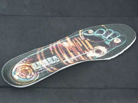シューズの側面には、ポッドの赤いライトをほうふつとさせる赤い点、かかとには公安9課の刺繍が入っている。インソールは攻殻機動隊のロゴと足の裏のイラストが入っている。
