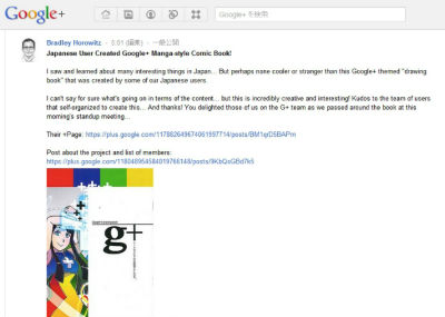 内容は日本語のため「よく分からないが、信じられないほどクリエイティブで面白い」と同氏は絶賛し、「ありがとう!」と感謝の言葉をつづっている。Google+チームの朝のミーティングで回し読みしたところ、チームメンバーは喜んでいたという。