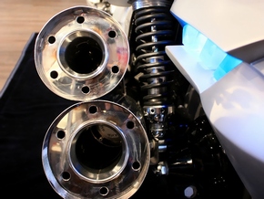 マフラーは原作のデザインに沿って片側に2本ずつ、V-MAXのオリジナルから、より太いものに交換されている。上はダミーで実際には下のマフラーだけが機能する。