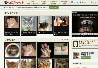 いぬドッグ同様、写真投稿サイト「Frickr」「Picasa」のAPIを使ってネコの写真を取得して表示しています。種類別の一覧や、ランダムで写真を表示する「ダラ見」もあります。キュートなネコがいっぱいで萌え萌えです。