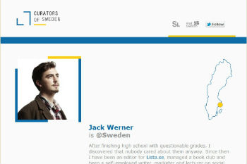 「Curators of Sweden」と呼ばれるこのプロジェクトは、観光PR機関VisitSwedenによるもの。市民が週替わりで「キュレーター」となり、@swedenアカウントを更新する。