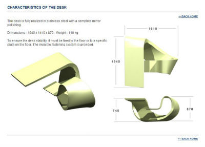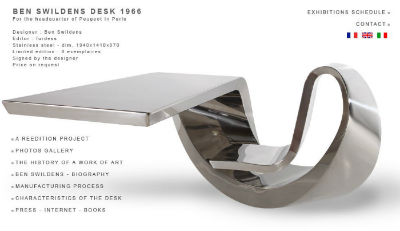 このデスクはアーティストのベン・スウィルデンズ氏がデザインしたもので、1枚の細長い金属のプレートを折り曲げて作ったかのよう。プジョー本社の受付用に3台作られ、その後オークションに出品されたり、デザインイベントで展示されたりしていました。