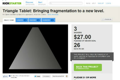 カリストさんは現在、資金調達サイトKickstarterで三角形タブレットを作るための資金を募っています。まだモックアップはなく、Android搭載ということ以外は決まっていないようです。目標は2012年1月21日までに2万5000ドル。これまでに集まった資金は27ドル。はたして実現するのでしょうか。