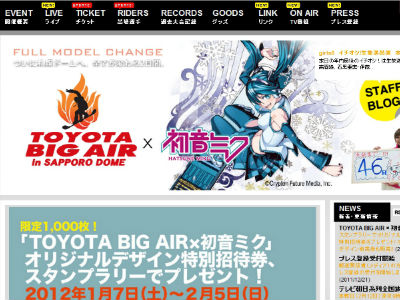 天使のミクさんがゲレンデに舞い降りる?――初音ミクがスノーボードのストレートジャンプ競技会「TOYOTA BIG AIR」(2012年2月11〜12日、札幌ドームで開催)のイメージキャラクターに起用された。