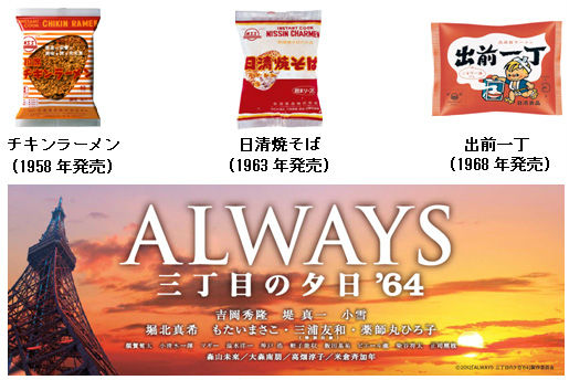 映画「ALWAYS 三丁目の夕日'64」とのタイアップで、「チキンラーメン」「日清焼そば」「出前一丁」の昭和復刻版パッケージが登場する。